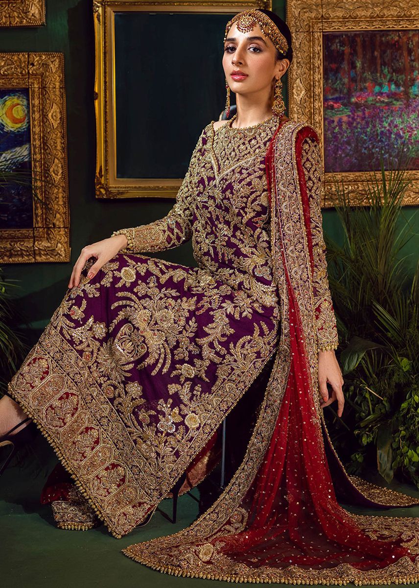 A traditional three piece ensemble heavily laden with hand embellishments and patterns. The shirt and dupatta are made out of net with consistent borders of raw silk. The look is locked with a raw silk azaar pants completed with borders