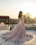 Description: Fashioned in a dainty khaadi net fabric, Naisha is an epitome of classic elegance. This set features a tessellated jaal of hand-cut sequins, dabka and naqshi layered with contrasting red blooming florals etched in resham and zardozi. Its richly detailed jaal is entwined with linear design accents wrought with cut dana and tilla that run through the length of the shirt. Paired with a gorgeously ornamented farshi gharara, gold dupatta adorned with an encrusted border all over and a contrasting red chaddar, Naisha is timeless in appeal.