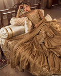 Description: Fashioned in a dainty khaadi net fabric, Naisha is an epitome of classic elegance. This set features a tessellated jaal of hand-cut sequins, dabka and naqshi layered with contrasting red blooming florals etched in resham and zardozi. Its richly detailed jaal is entwined with linear design accents wrought with cut dana and tilla that run through the length of the shirt. Paired with a gorgeously ornamented farshi gharara, gold dupatta adorned with an encrusted border all over and a contrasting red chaddar, Naisha is timeless in appeal.