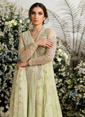 The sheer, kiwi green net kalidaar is layered over a shimmering strappy bustier, also heavily hand worked.