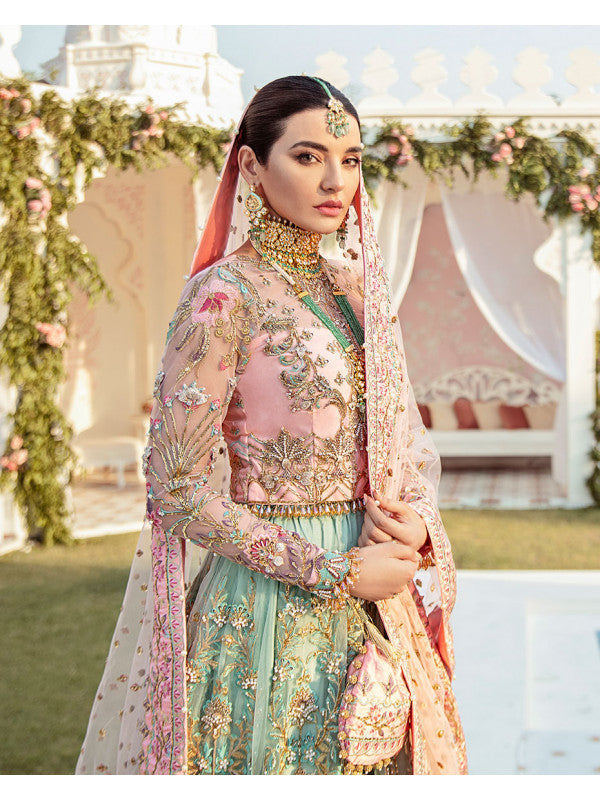 Joli - Inspired by the Rajhistani culture, we bring you the Rajkumari lehnga choli color blocked in a unique combination of pink and sea green with intricately hand-worked embellished details encrusted with pearls, gotta, dabka, nakshi, crystals, mukaish, pitta and many more. The pink tulle dupata is filled with a booti spray and is decorated with four sided silk borders with heavy pearl tassel details.