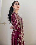 A deep maroon ensemble adorned with intricate silver thread work and delicate floral embroidery. The luxurious fabric flows gracefully, enhanced by detailed patterns that reflect classic Eastern craftsmanship. Flattering straight cut with full sleeves and a round neckline, this design strikes the perfect balance between traditional charm. The embellished borders and rich embroidery make it an ideal choice for festive occasions, weddings, or formal gatherings.