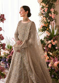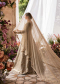 “Minha” is all about delicacy personified on a nude colored organza pishwas, which exhibits heavenly embellished geometric and floral patterns, adorned with rich, magnificent details. Paired with a self jamavar lehanga, with fully embellished exquisite border along with delicately paired with net dupatta with four sided embellished border and extended pallu and booti spray. Moreover, a beautiful light champagne luxe net veil with pearls spray and four-sided intricate border has been added to give a goddess look to the outfit.