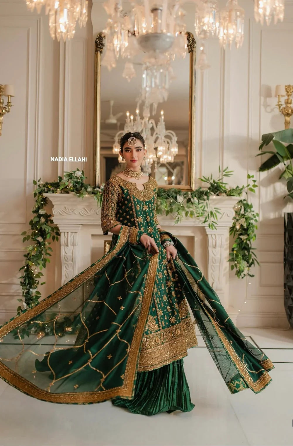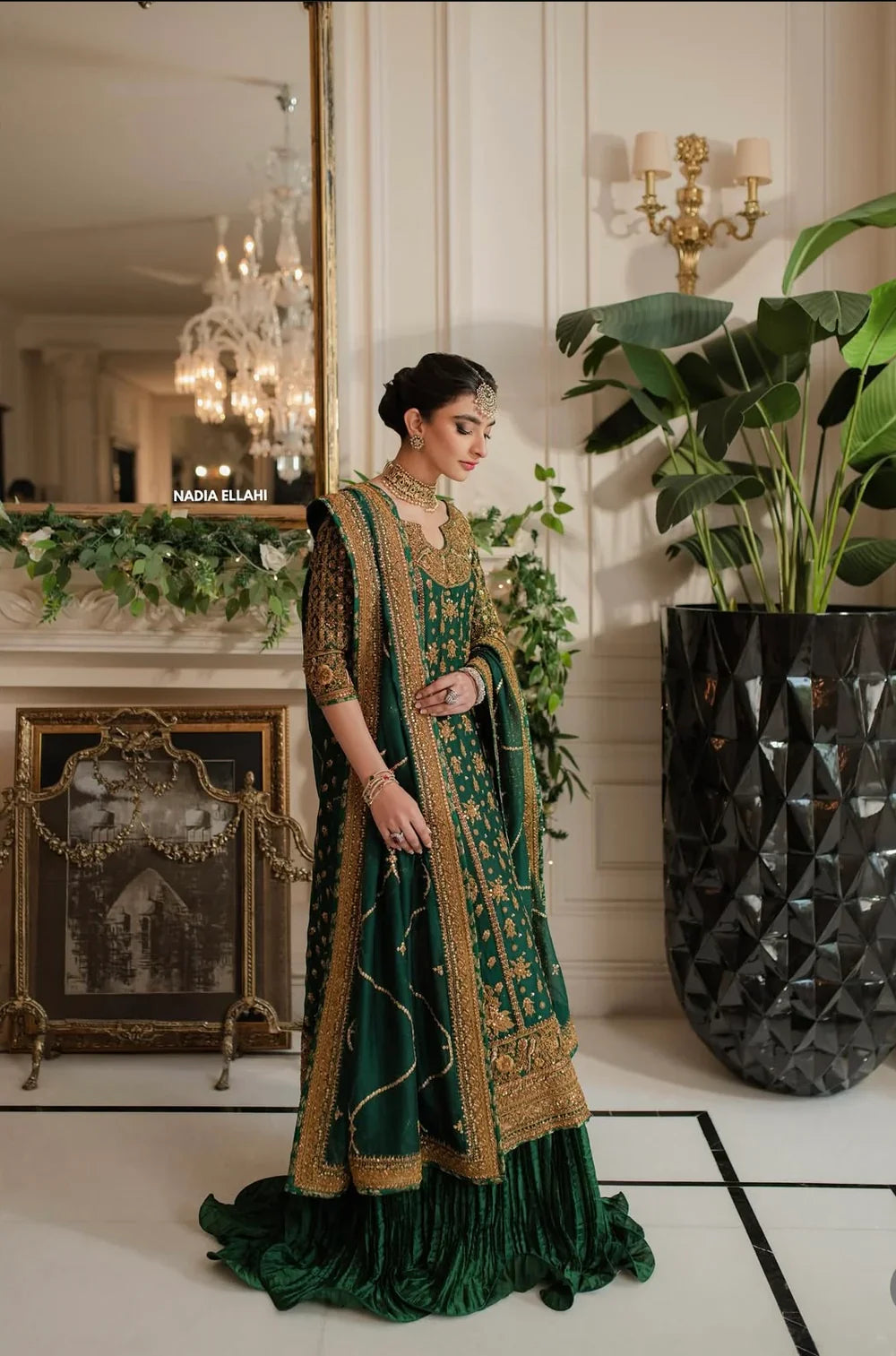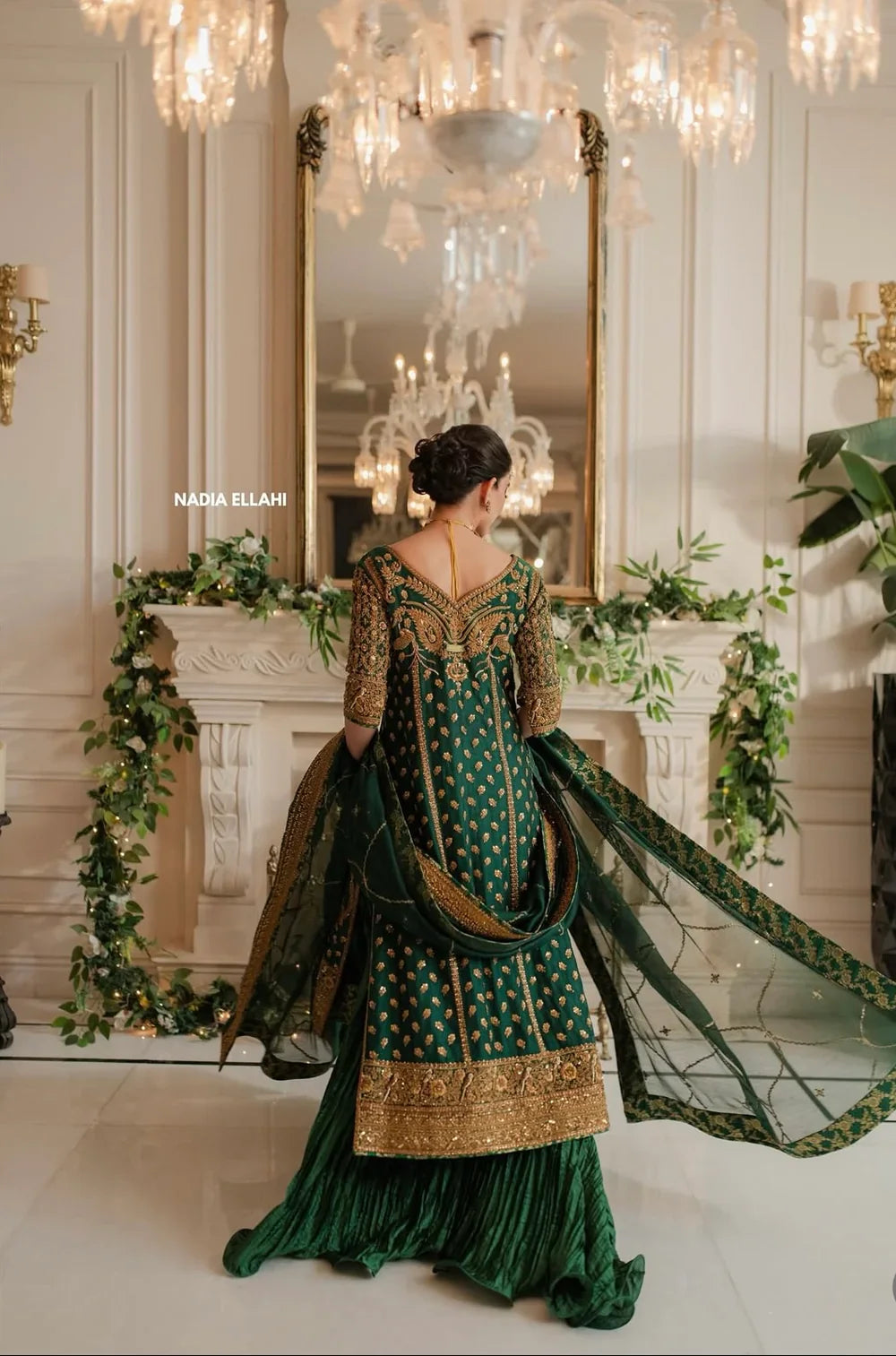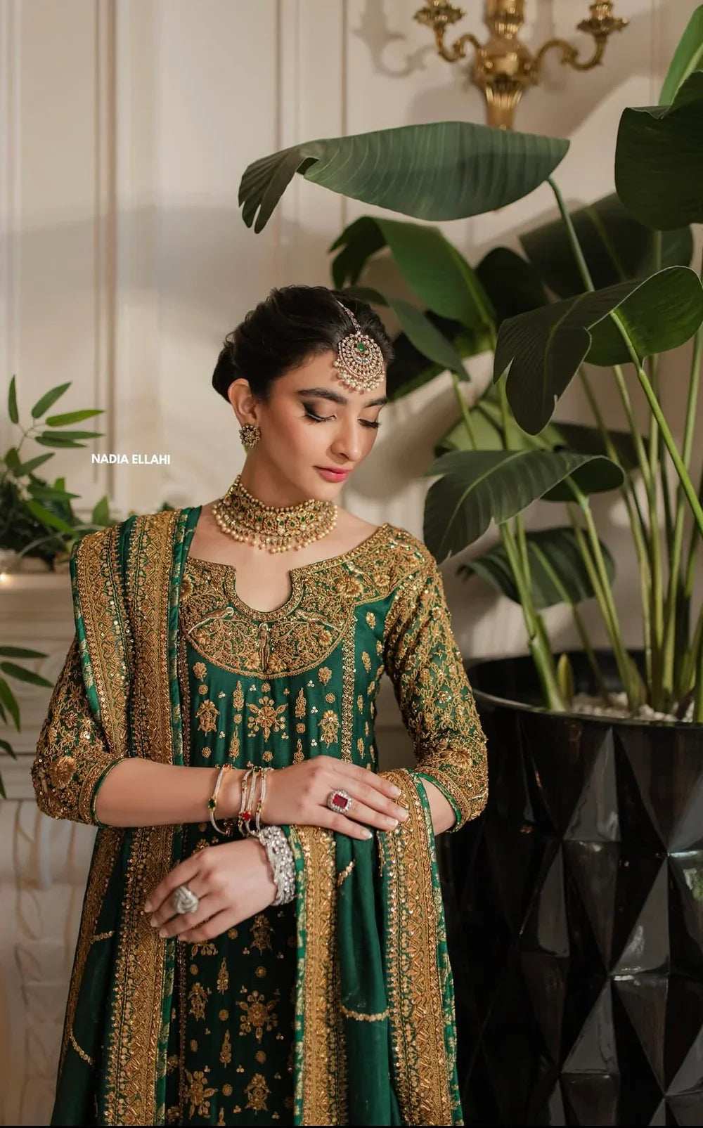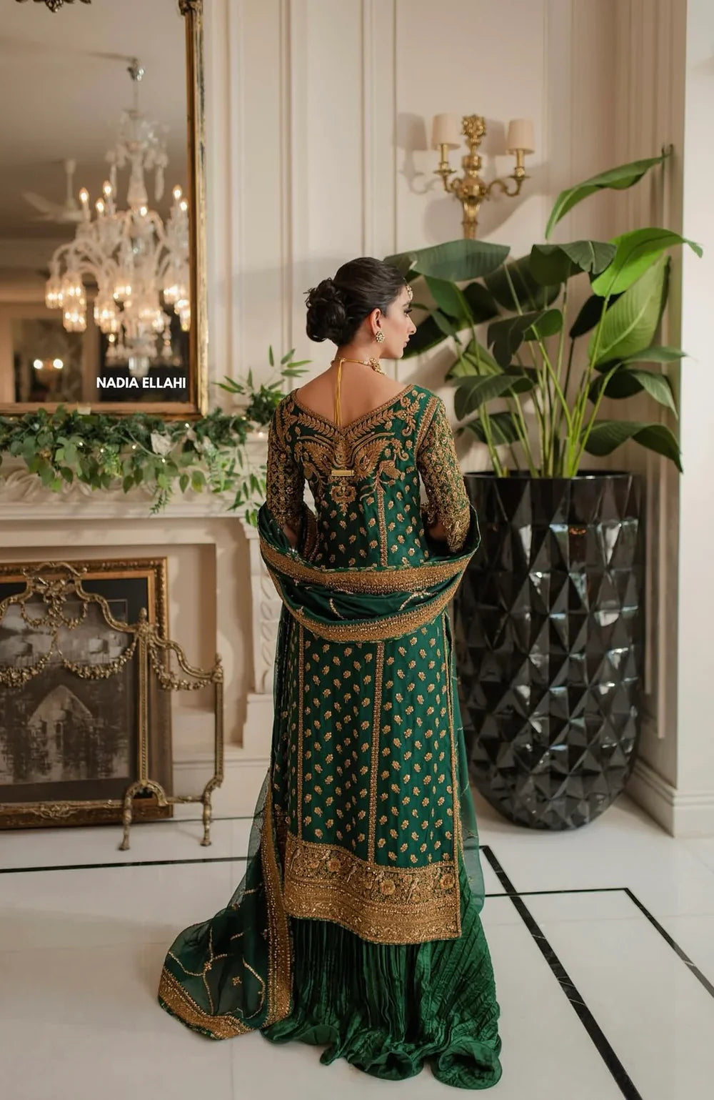 “Mehrunissa by Nadia Ellahi” is an opulent ensemble that embodies regal charm and timeless sophistication. Designed with meticulous attention to detail, it features exquisite hand embroidery, intricate embellishments, and luxurious fabrics that drape gracefully. The ensemble’s rich color palette and delicate craftsmanship reflect a perfect fusion of tradition and modern elegance, making it an ideal choice for those who seek refinement and grandeur.