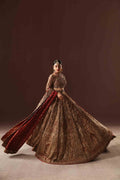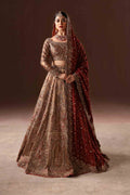 An immaculate vision of grandeur comes to life in this design which exudes an old world charm. Finely crafted flora and fauna cover the lehnga with intricate zardozi work with touches of rust resham. Hints of gilded golden 'succha' gota add further beauty to this regal design. The zari net dupatta is hand dyed to a gorgeous rust colour with heavily embellished borders all around. Fine dapka and resham work enhance the beauty alongwith an all over hand made flower booti. The choli is covered in a full jaal with beautiful flowers and delicate leaves crafted in fine dapka and resham, with fine sequins to add a sheen.