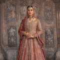 A Bold vermilion front open, soft net pishwas is adorned with magnificent rose motifs on the bodice using Dhabka, Nakshi and Mukesh. It is layered over a jamawar lehnga with an ethereal, scalloped tissue dupatta with an intricate yet heavy zardozi border. Dreamy and purely majestic this bridal outfit has an old-world charm reflected through the use of fabrics and hues. Truly a modern day classic.